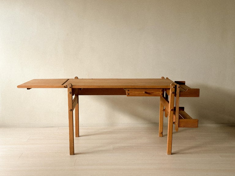 A desk designed by Edvin Helseth and produced by Stange Bruk in Norway in the 1960s. Executed in solid pine, the piece reflects a restrained, architectural approach with clean lines and a warm, natural surface. The construction is straightforward and functional, with visible joinery and a focus on material and proportion, characteristic of Norwegian cabinetmaking of the period. Wear consistent with age and use. Marks, scratches, and patina. Structurally sound.