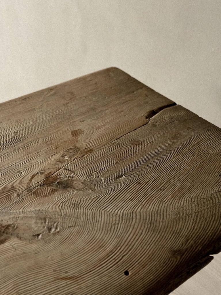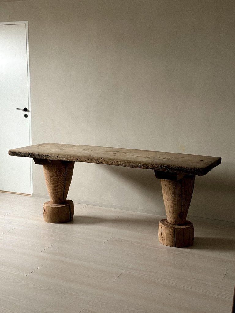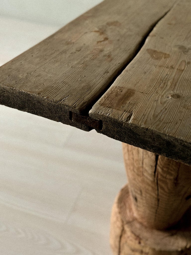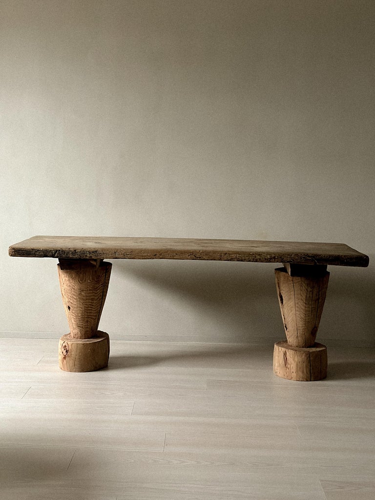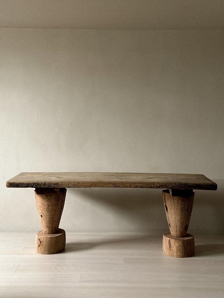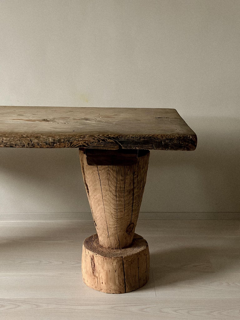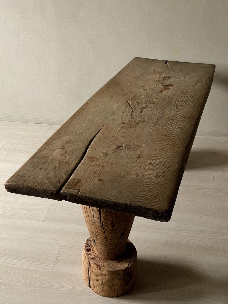 Primitive table crafted from a single solid plank dating back to the 1600s/1700s, with a hand-hewn underside. The piece stands on two pillar log feet, originally used as structural supports under old Scandinavian storehouses or similar buildings from the 1700s/1800s. The legs have been adapted for stability and height while retaining their original character. A true wabi sabi piece with visible age, wear and old surface.