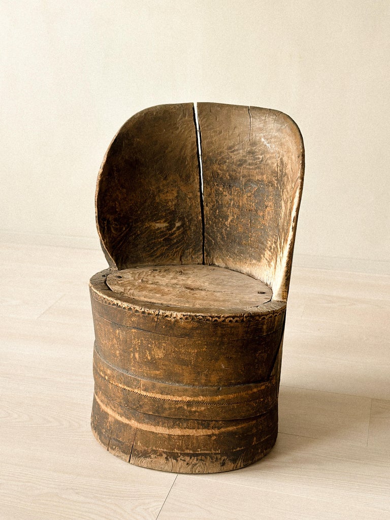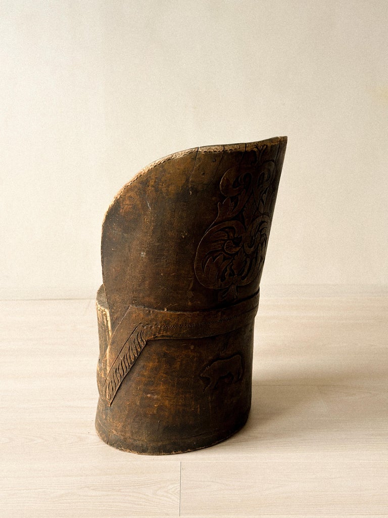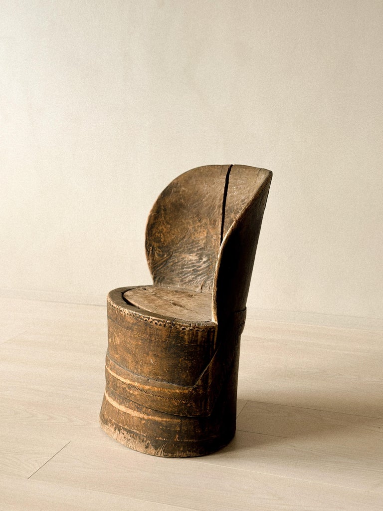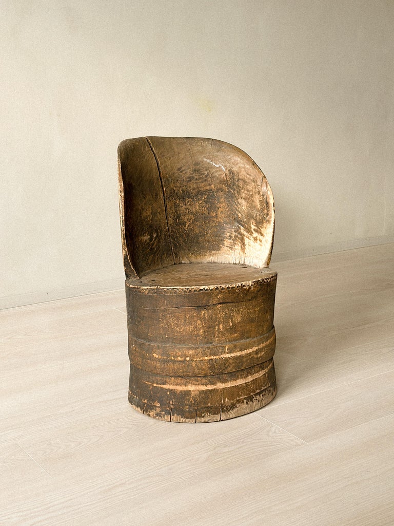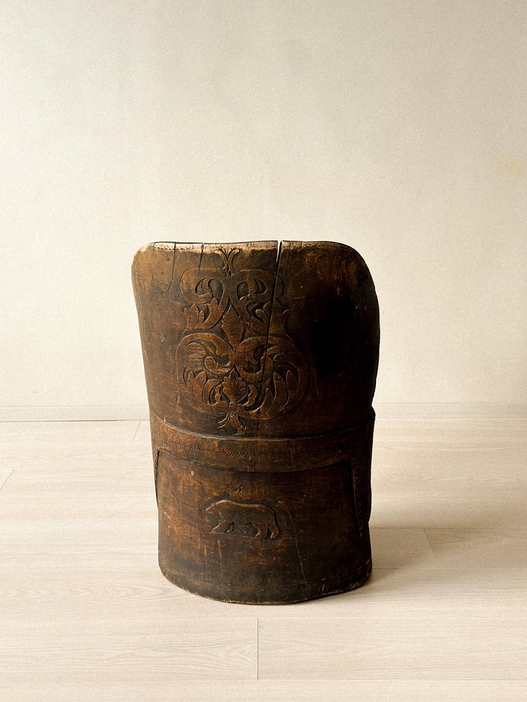 Carved wooden chair, Scandinavia, circa 1700s. Hewn from a single log with rounded seat and high sculpted backrest. A wonderful deep and dark patina. Visible cracks and age-related wear consistent with use.